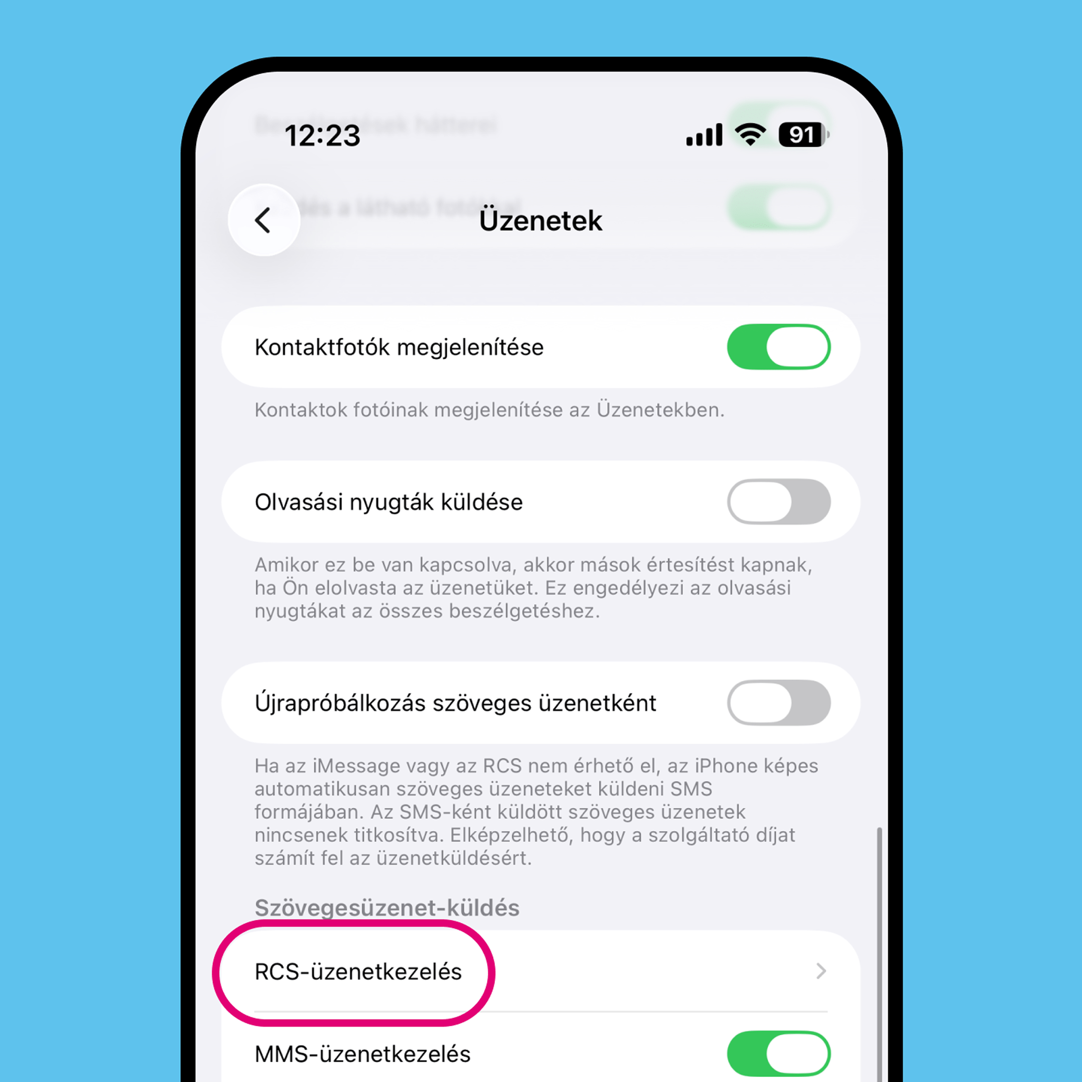 Az Üzenetek alkalmazásban görgess le az RCS-üzenetküldés menüponthoz.